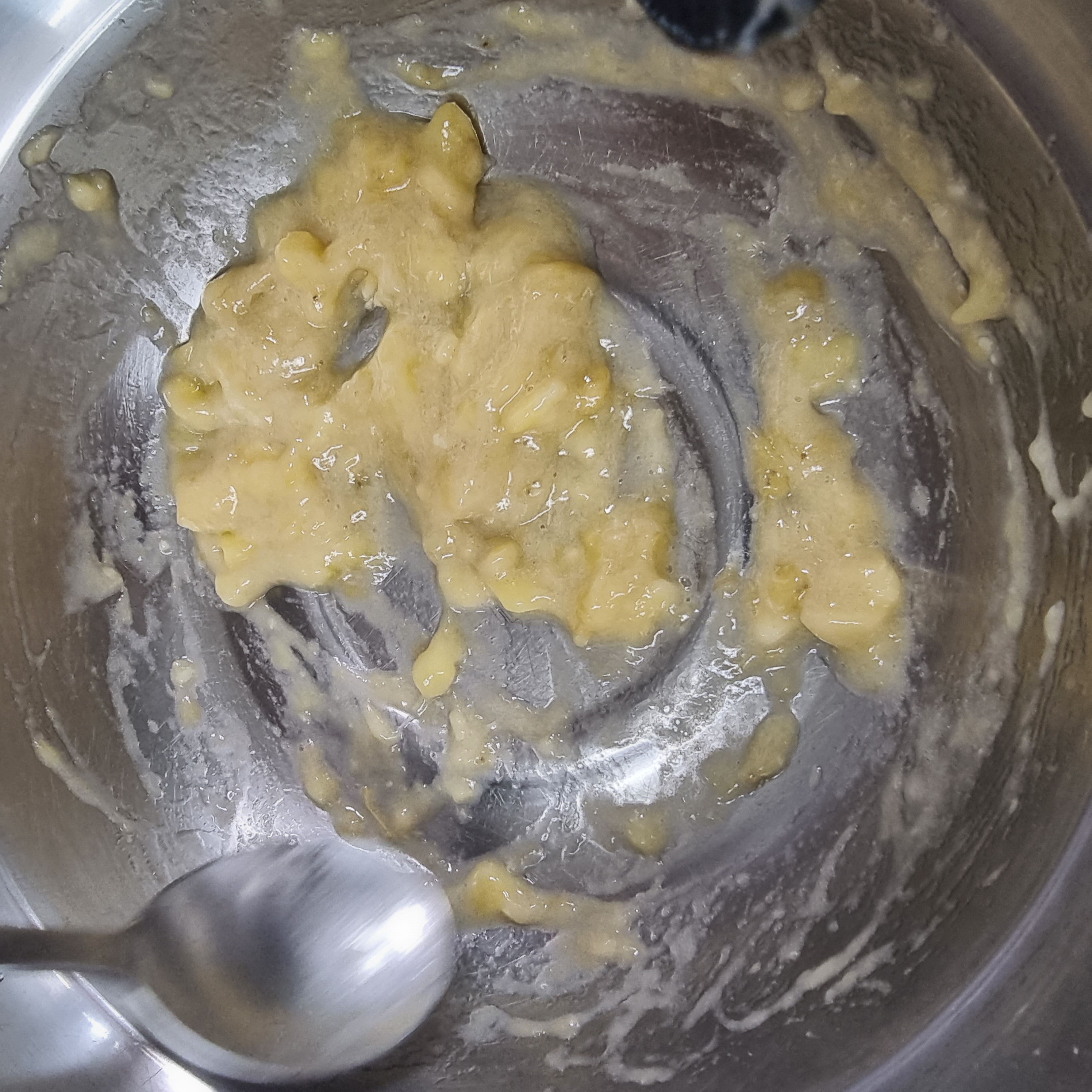 2. 달걀 1개를 깨서 으깬 바나나에 섞어 바나나 덩어리를 완전히 없애줍니다.