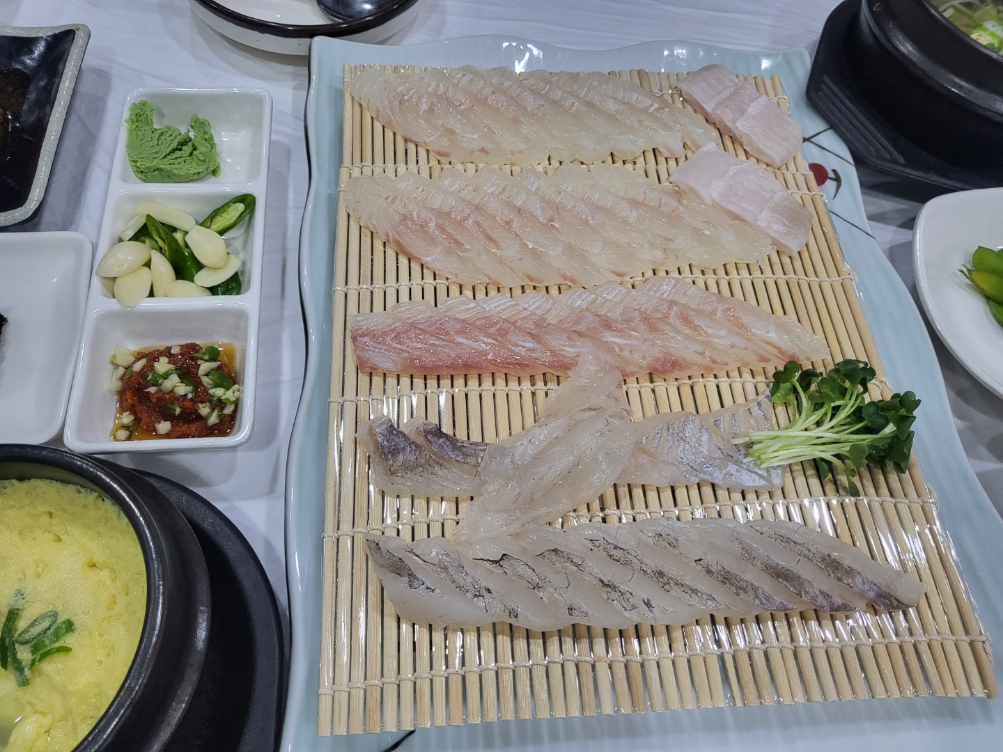 갤러리아로 쇼핑가서 옷 사고, 횟집에 왔다.